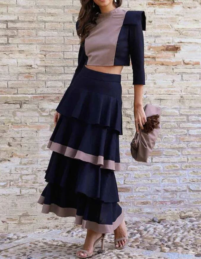 La falda de longitud midi presenta volantes, una cintura alta y ancha para definir la silueta, y un cierre de cremallera en la parte posterior. Es el conjunto de dos piezas perfecto para invitados.