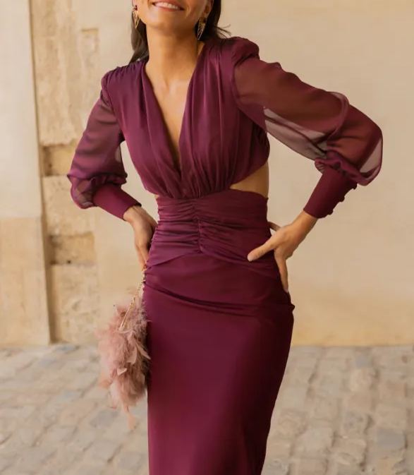 Elegante combinación de crepe en falda y gasa drapeada en escote y cintura que hacen de este diseño una atentica pasada. Sus maxihombreras unidas a unas preciosas mangas que acaban con un precioso puño abotonado.